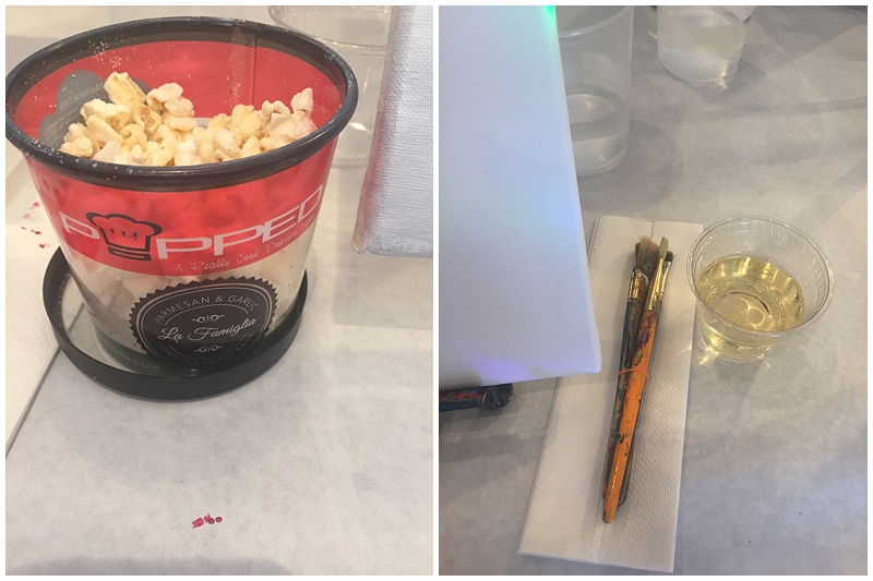 Half way through the class we had a 10 minute intermission to let the paint dry before moving on to the next section. It was a good time to take a break and stretch! The instructor took the time to share some news about upcoming classes, their facebook contest, and to give info on booking a party there too. I think this would be a great idea for a bridal or baby shower! They also host kid parties, which I would love to do for the kiddos! How fun would that be? And the best part is there’s no clean up for parents afterwards!